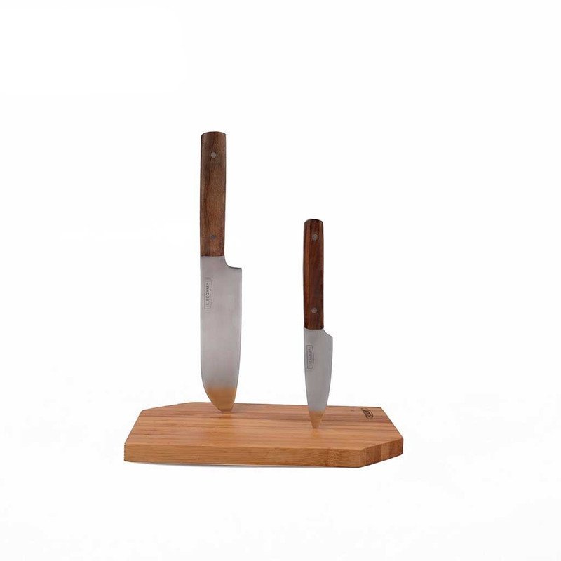 ست چاقو و تخته لایف کمپ شامل ۶ قطعه است که شامل دو کارد با تیغههای استیل ضدزنگ، قاشق و چنگال، یک تخته برش از جنس بامبو و یک کیف حمل زیپی برای نگهداری تمامی اجزا میشود. طراحی منحصر به فرد این مجموعه نه تنها زیبایی خاصی دارد، بلکه آن را به یک انتخاب ایدهآل برای آشپزان حرفهای تبدیل میکند.