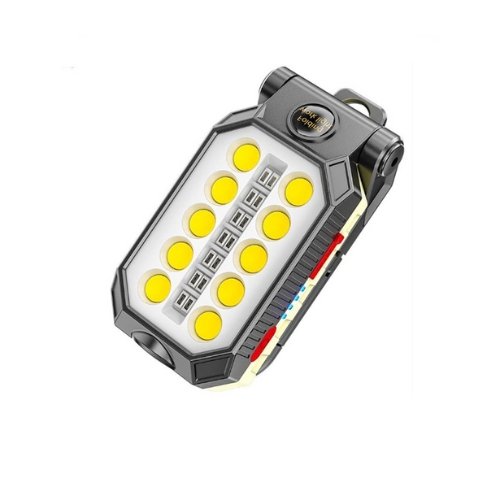 پروژکتور WORKING LAMP مدل W599B برای استفاده در کمپینگ، کوهنوردی، طبیعتگردی و یا استفاده به عنوان چراغکار مناسب میباشد. جنس بدنه این محصول از پلاستیک محکم ساخته شده و از سه لامپ تشکیل شده است. یک لامپ در جلو تعبیه شده که به عنوان چراغ قوه هم قابل استفاده است و دارای نوردهی عالی میباشد. لامپ دوم متشکل از لامپ های LED بسیار شفاف بر روی بدنه چراغ است که برای روشنایی محوطه استفاده می شود و بسیار قوی و پر نور است و ۵۰ متر مربع را به خوبی روشن میکند. نوع سوم چشمک زن قرمز و آبی که از حالت چشمک زن آن برای مواقع اضطراری و خطر استفاده میشود.این چراغ شارژی دارای یک پایه محکم است که میتوان به شکل رومیزی از آن استفاده کرد. بر روی این پایه مگنت آهنربایی برای نصب بر روی سطوح فلزی تعبیه شده است.