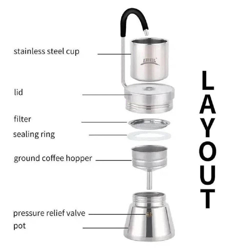 اگر عاشق قهوه خوب در طبیعت هستید، قهوه ساز بی آر اس مدل BRS-TC05 مخصوص شما طراحی شده است. این دستگاه بهصورت موکا پات (Moka Pot) از جنس فولاد ضدزنگ ساخته شده، وزن تقریباً ۶۵۰ گرم و ظرفیت حدود ۲۵۰ میلیلیتر یا حتی ۵۰۰ میلیلیتر دارد.