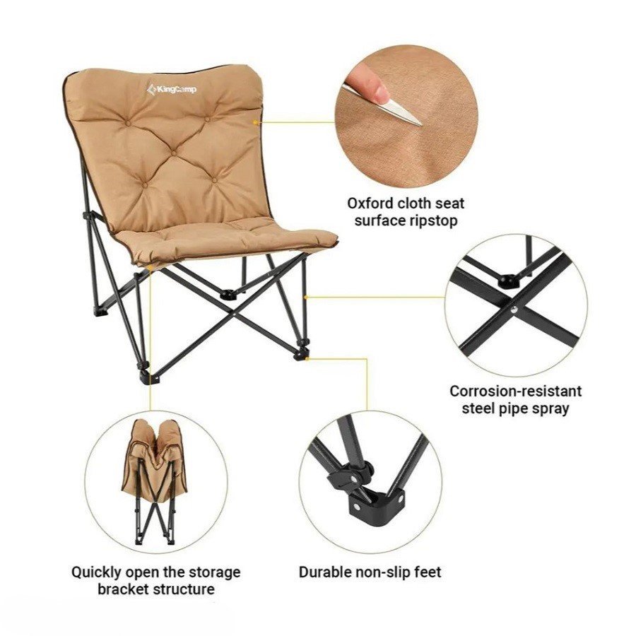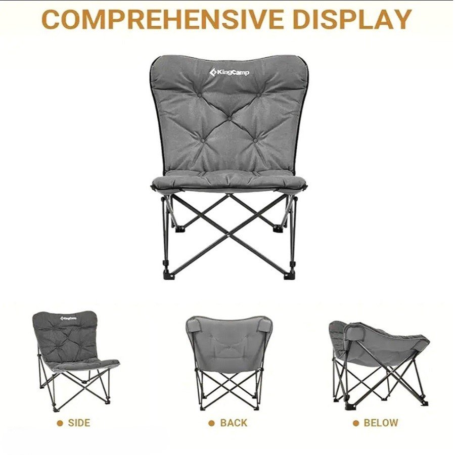 صندلی KingCamp Oversized Camping Folding Chair طراحی شده است تا حداکثر آرامش را در فضای باز فراهم کند. با پد دوبل، پشتی طبی قابل تنظیم، و قابلیت تحمل وزن تا ۲۰۴ کیلوگرم (۴۵۰ lb)، گزینهای عالی برای کسانی است که دنبال ساختار محکم و راحتی در سفر هستند. بدنه از فلز با پوشش ضدزنگ و پارچه Oxford 600D مقاوم ساخته شده و دارای جیب جانبی، جاپلاستیکی دوار و کیف حمل با بند دوشی برای حمل آسان است.