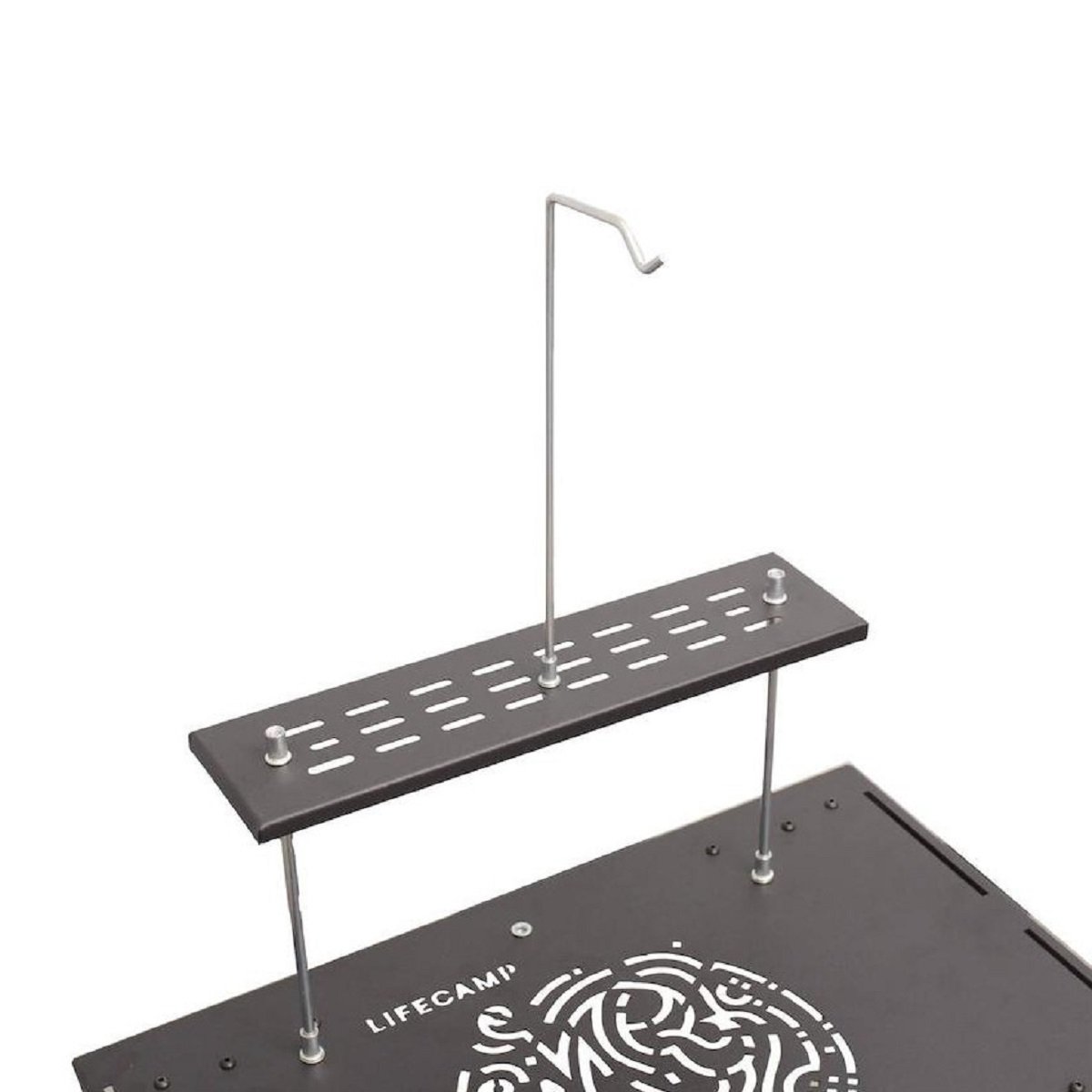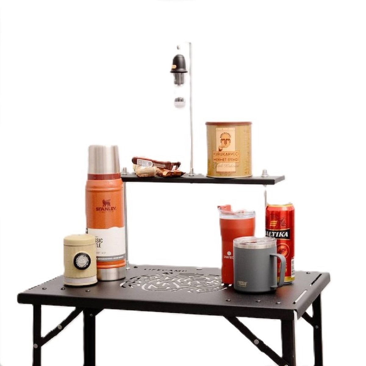 بارزترین ویژگی این میز، طراحی دوطبقه آن است؛ وجود یک شلف (طبقه دوم) در پایین میز، فضای کاربردی اضافی برای قرار دادن وسایل کوچک، ابزارها یا لیوانها فراهم میکند و به نظمدهی محیط کمپ کمک میکند. همچنین، مجهز بودن به یک آویز فانوس در قسمت بالا، امکان روشن کردن فضای اطراف میز را در تاریکی شب به آسانی فراهم میآورد.