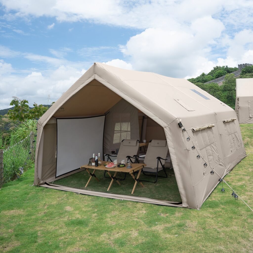 ویژگی برجسته این چادر، ستونهای بادی آن است که از جنس PVC با مقاومت بالا ساخته شده و نصب آن را بدون نیاز به تیرکهای فلزی سنتی، تنها با استفاده از تلمبه همراه، به سرعت و به صورت اتوماتیک ممکن میسازد. جنس بدنه از پلیاستر 600D ضخیم با شاخص ضدآب 2000 میلیمتر است که محافظت کامل در برابر بارش شدید را تضمین میکند. همچنین، کف چادر از پارچه مشبک PVC مقاوم در برابر سایش ساخته شده است. این طراحی دو لایه و تنفسپذیر، این چادر را برای چهار فصل و کمپهای طولانیمدت در شرایط متغیر جوی مناسب میسازد.