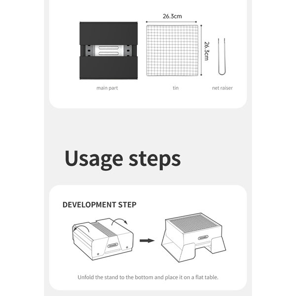 بدنه از فولاد نورد سرد، صفحات فولادی آبکاری آلومینیوم و آهن آبکاری کروم ساخته شده که مقاومت بالایی در برابر حرارت و استفاده طولانیمدت دارد. ابعاد بازشده شومینه 38×30.5×20 سانتیمتر بوده و در حالت جمعشده تنها 31×30.5×14 سانتیمتر فضا اشغال میکند؛ بنابراین بهسادگی در کولهپشتی یا صندوق خودرو قرار میگیرد.