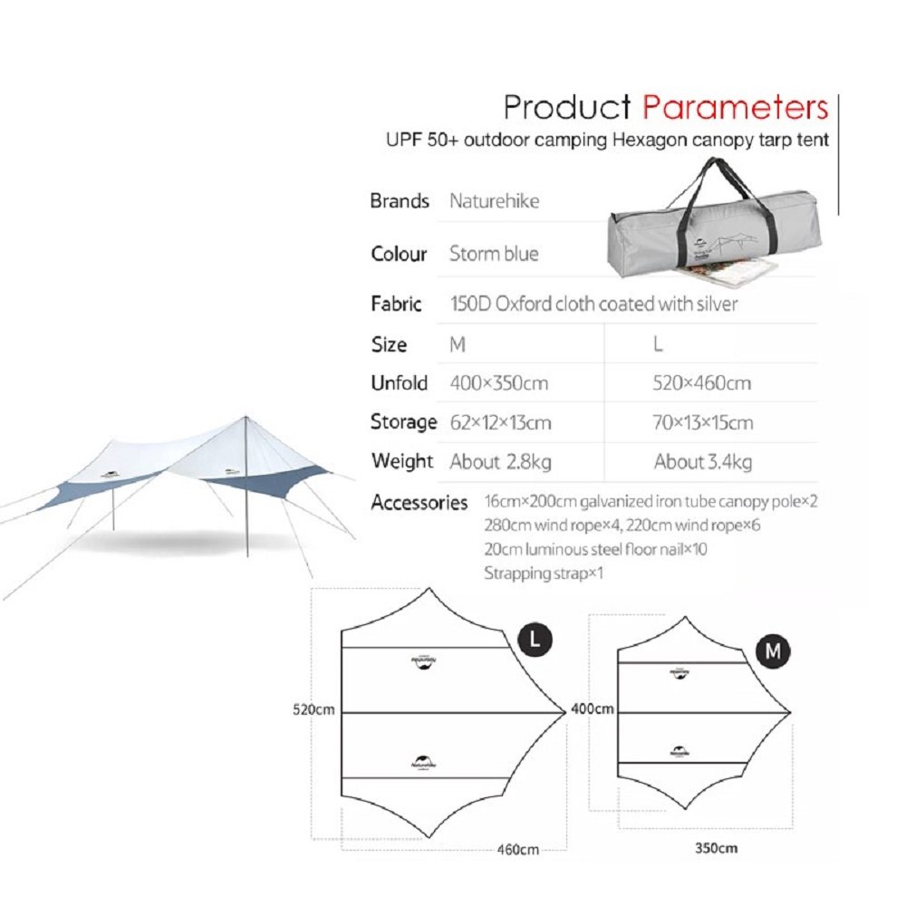 این سایبان کمپینگ (تارپ) شش ضلعی از برند نیچرهایک مدل NH16T012-S با ابعاد ۴۰۰×۳۵۰ سانتی متر، انتخابی عالی برای نفرات ۳ تا ۴ در محوطه های باز، کمپینگ، ساحل یا پیک نیک است. جنس پارچه از Oxford 150D با پوشش ضد آب و محافظ UV 50+ بوده و طراحی تمهید شده آن باعث شده تا آب به راحتی جمع نشود.