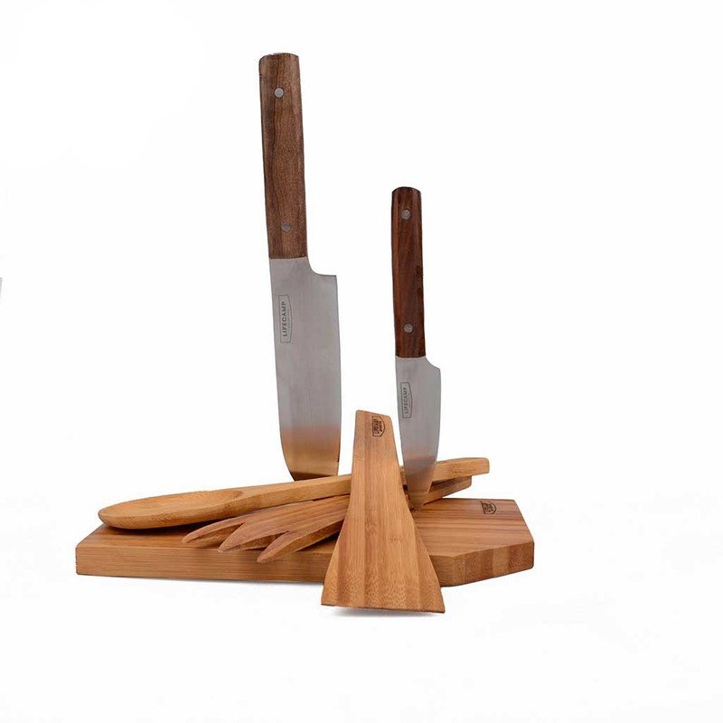 ست چاقو و تخته لایف کمپ شامل ۶ قطعه است که شامل دو کارد با تیغههای استیل ضدزنگ، قاشق و چنگال، یک تخته برش از جنس بامبو و یک کیف حمل زیپی برای نگهداری تمامی اجزا میشود. طراحی منحصر به فرد این مجموعه نه تنها زیبایی خاصی دارد، بلکه آن را به یک انتخاب ایدهآل برای آشپزان حرفهای تبدیل میکند.