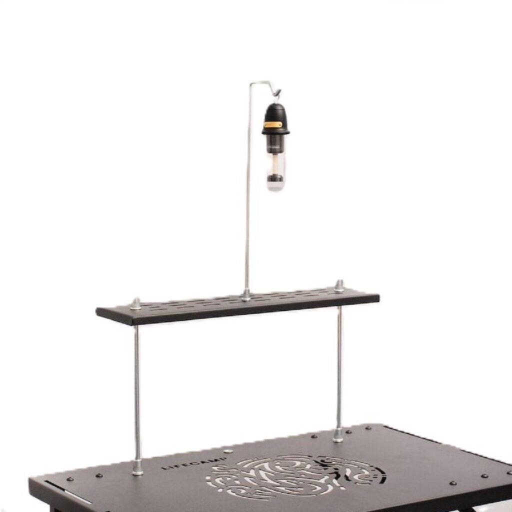 بارزترین ویژگی این میز، طراحی دوطبقه آن است؛ وجود یک شلف (طبقه دوم) در پایین میز، فضای کاربردی اضافی برای قرار دادن وسایل کوچک، ابزارها یا لیوانها فراهم میکند و به نظمدهی محیط کمپ کمک میکند. همچنین، مجهز بودن به یک آویز فانوس در قسمت بالا، امکان روشن کردن فضای اطراف میز را در تاریکی شب به آسانی فراهم میآورد.
