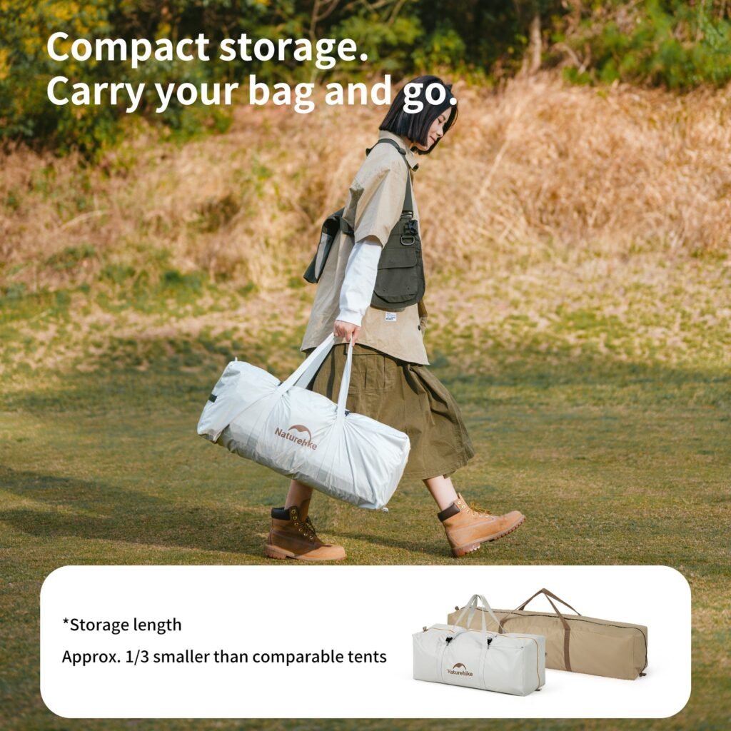 چادر وزن مناسبی دارد ( ۶.۵ کیلوگرم، و تا ۸.۵ کیلوگرم با لوازم کامل)، و در ابعاد بستهبندی جمعوجور ۶۰ × ۲۵ × ۲۵ سانتیمتر قرار میگیرد—این یعنی حمل آسان و مناسب برای سفرهای کمپینگ، پیادهروی یا پیکنیک.